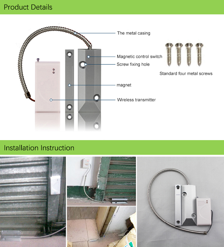 As shown in the figure above: Use screws to separate and fix the magnet and the magnetic control switch,and the effective distance between the two should not exceed 2cm.When the rolling shutter is illegally pulledup, the detector immediately sends a signal to the alarm host (the host can be placed in the bedroom living room and other places where the alarm is easy to receive, preferably in a relatively hidden place)and the alarm host in the alert state will receive it. After the signal, an ear-piercing alarm sounded immediatelyto scare off the thief, and at the same time, it dialed the pre-stored alarm number to notify the owner to dealwith the alarm quickly.