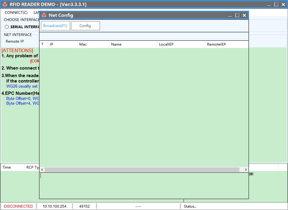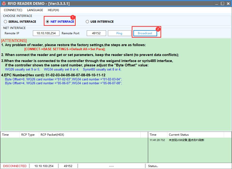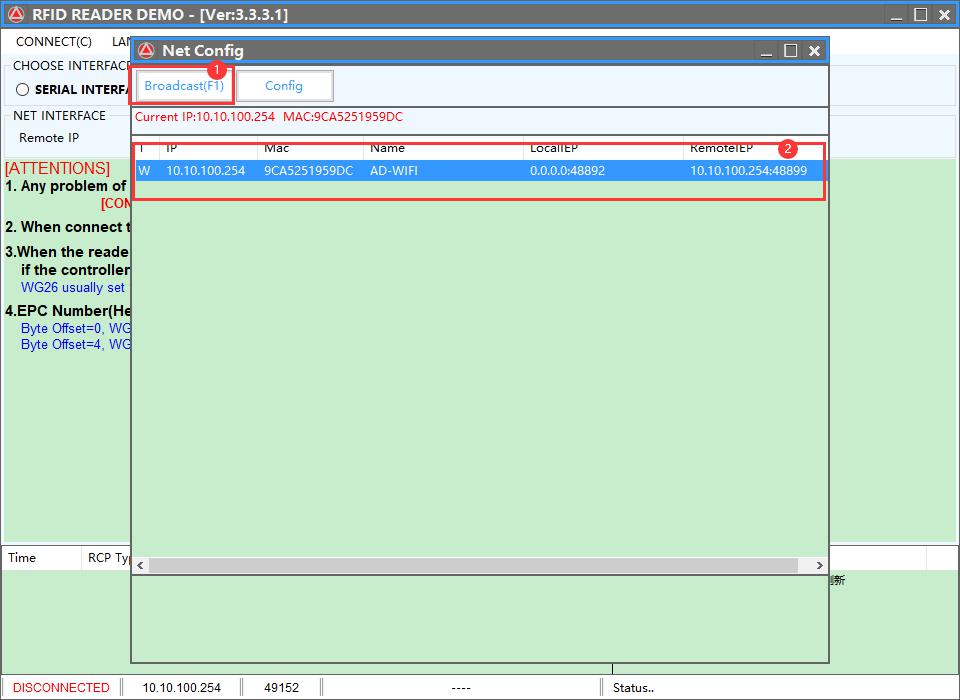 #4: Open the demo program, select NET INTERFACE, and click Broadcast;
