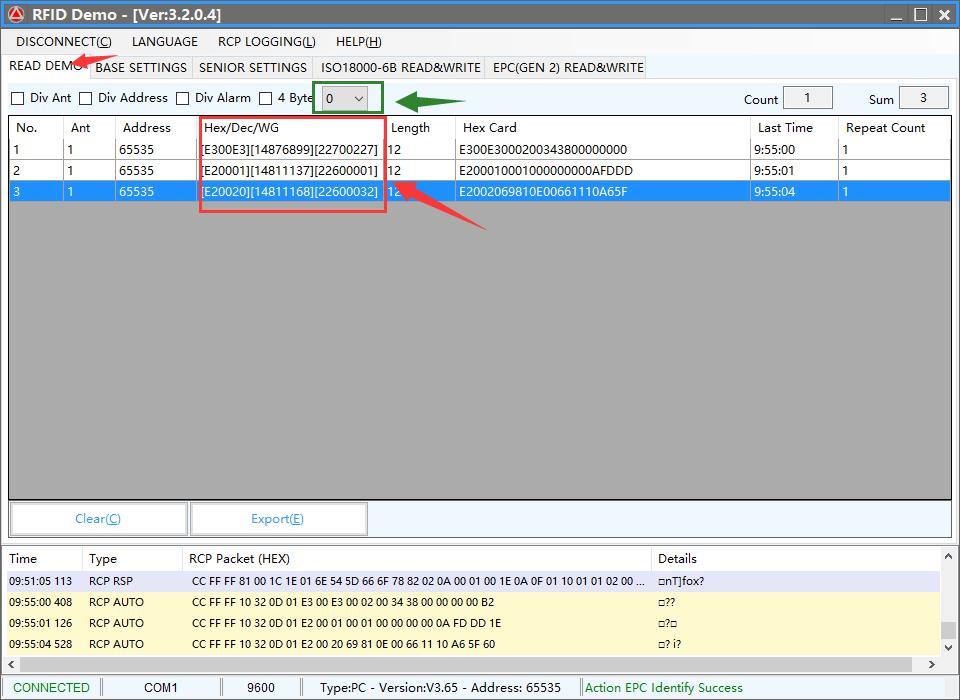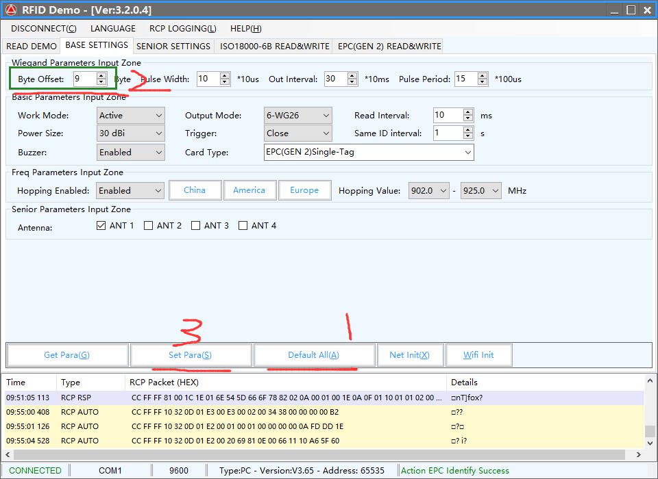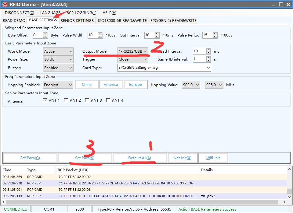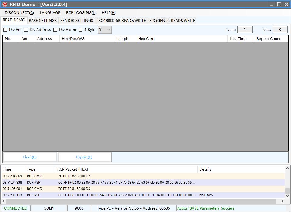 1) connect the pc and reader use the serial port, and use the “RFIDDemo.exe”;