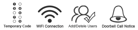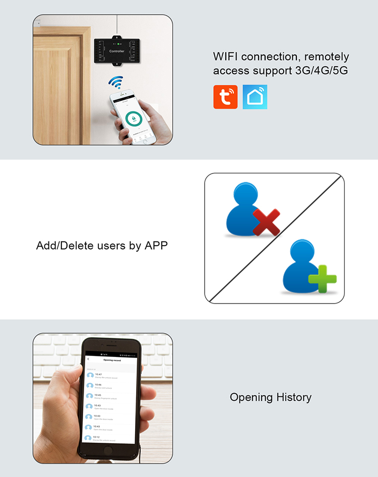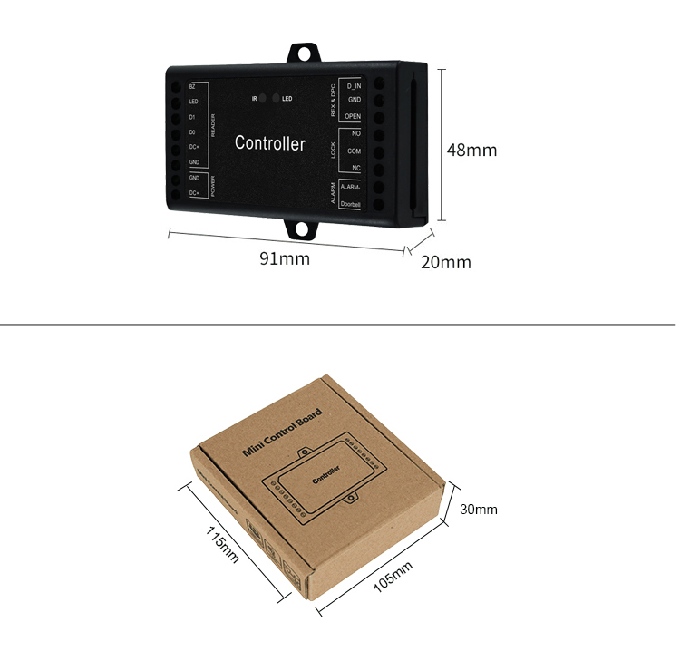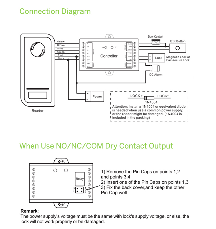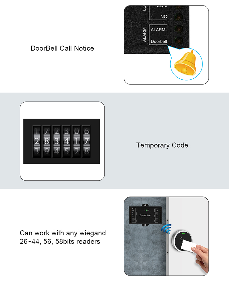 | Wiring Connections | Relay output, exit button, alarm, door contact, Wiegand input |