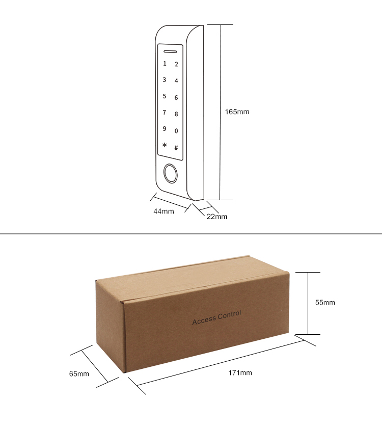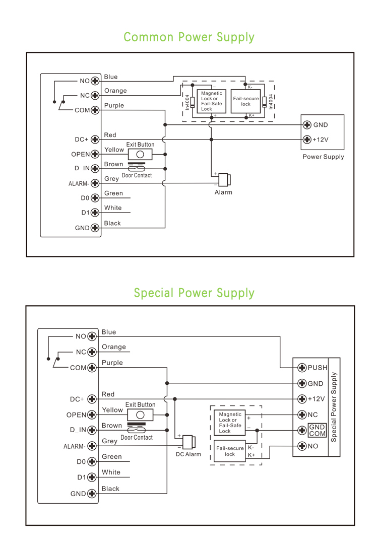 | Wiring Connections | Relay output, exit button, alarm, door contact, Wiegand input/output |