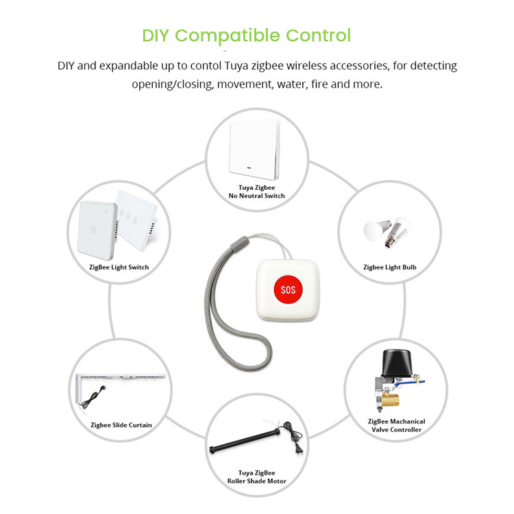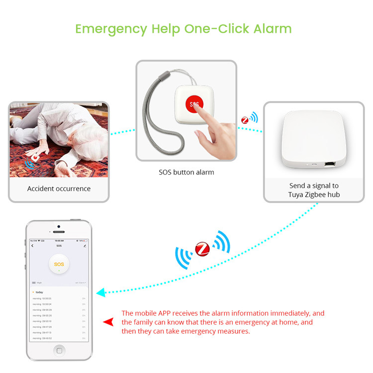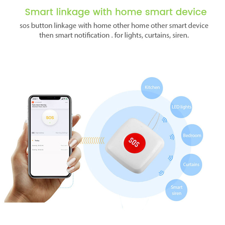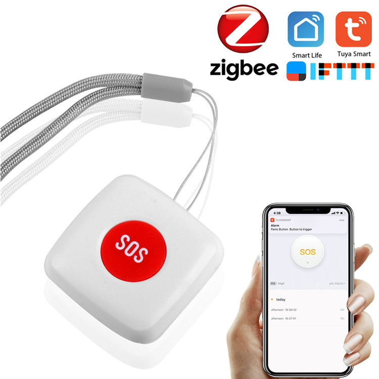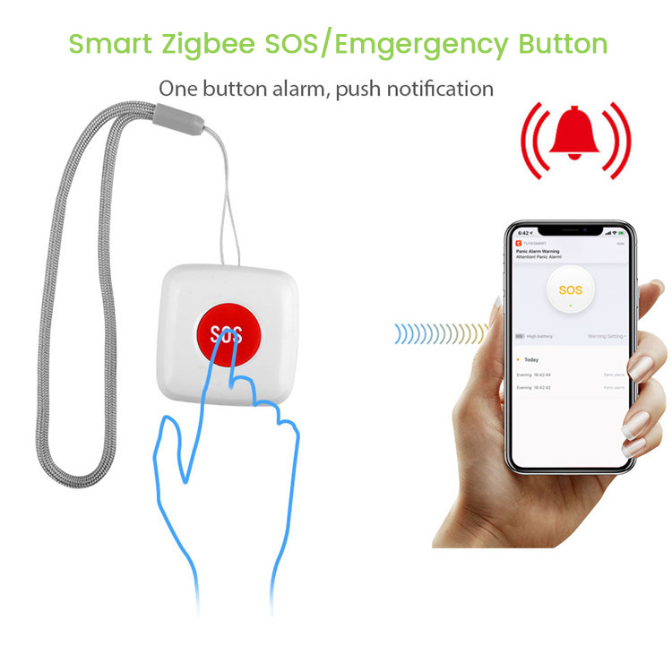 > ZigBee Tuya SOS button linkage with home other smart devices such as lights, curtains, siren, then notifications pushed. Low-consumption design, which can make it work long time.