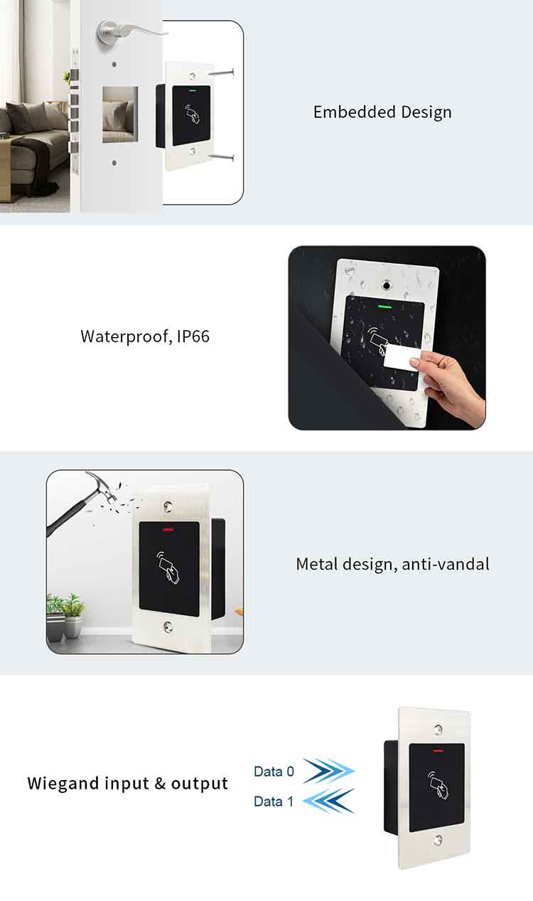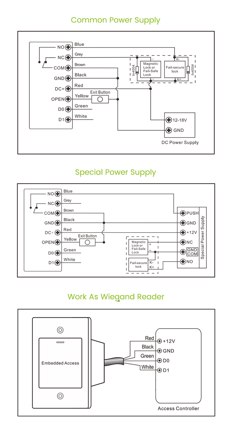 | Wiring Connections | Relay output, exit button, wiegand(in&out) |