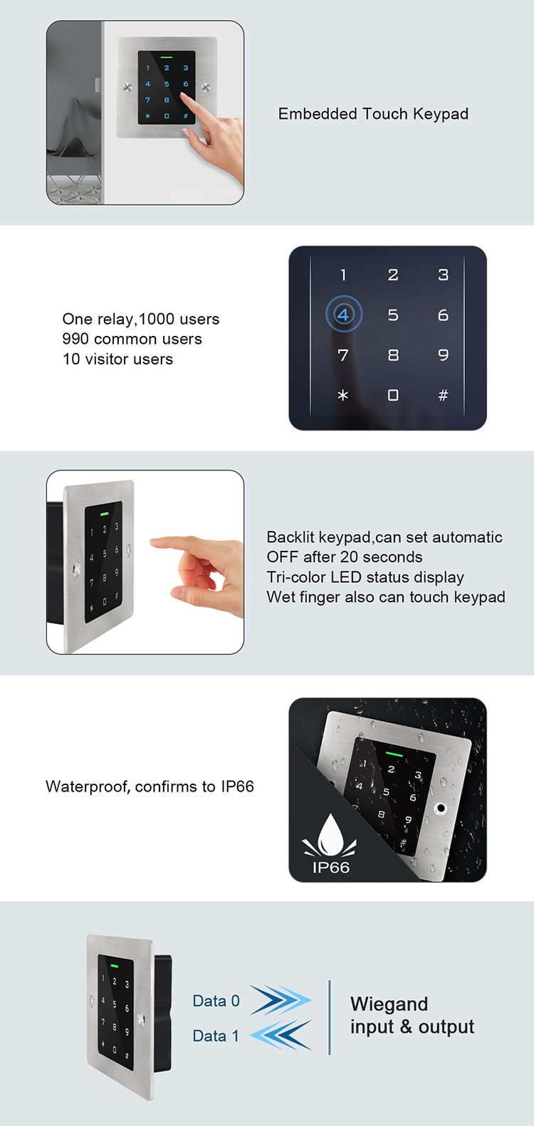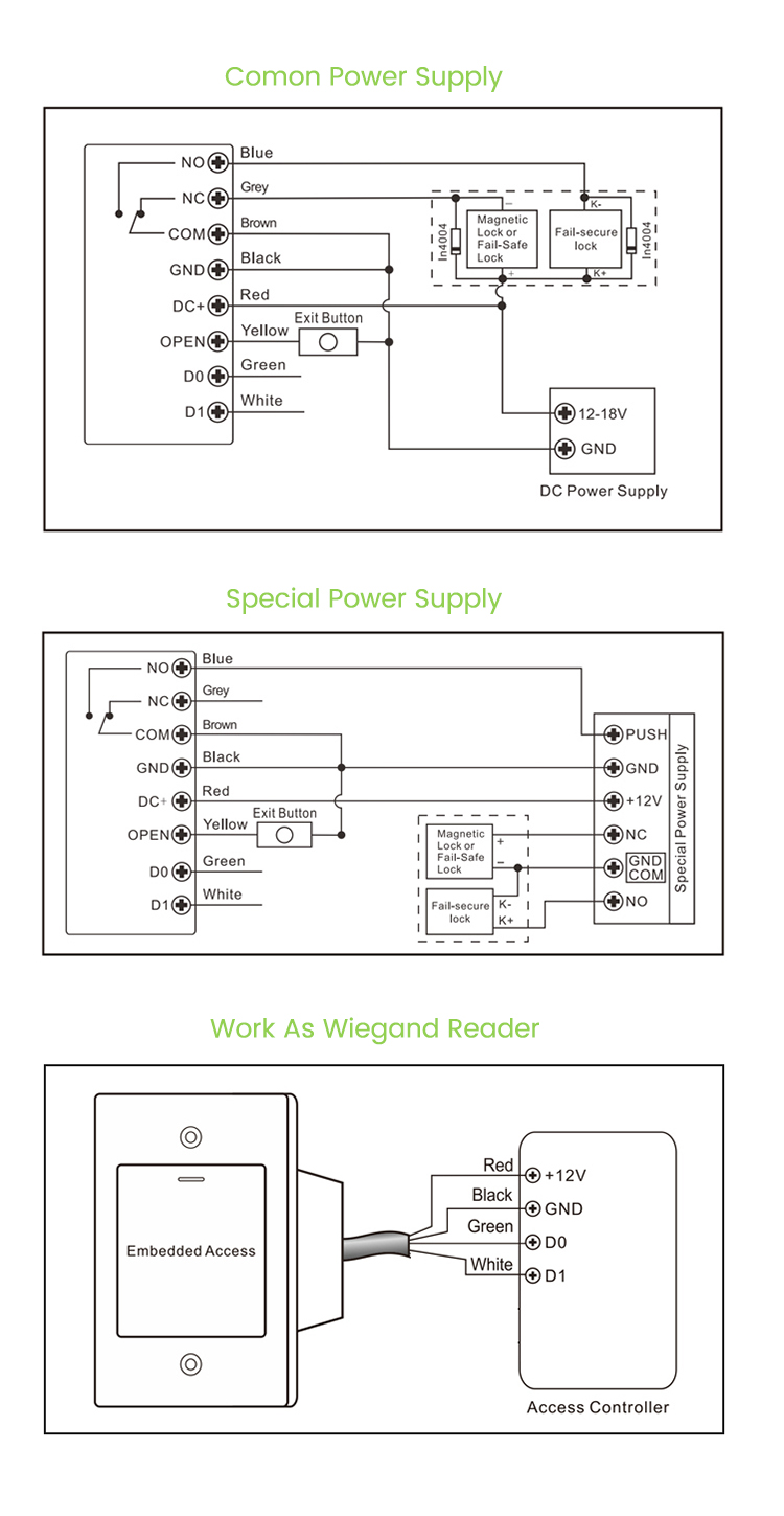 | Wiring Connections | Relay Output, Exit Button, wiegand(in&out) |