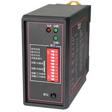 The various modes are selected by changing the position of switches on the front of the unit. The detector oscillator is multiplexed to eliminate any possibility of crosstalk between the loops connected to the detector. The switches allow for different loop frequency settings, sensitivity settings and modesettings.