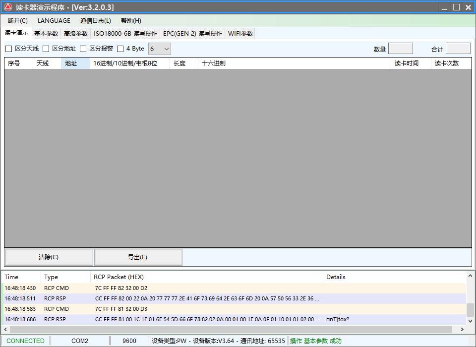 1)将读卡器串口连接电脑 ,使用DEMO联机,如下图: