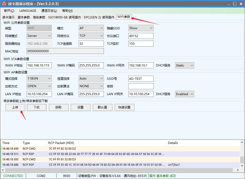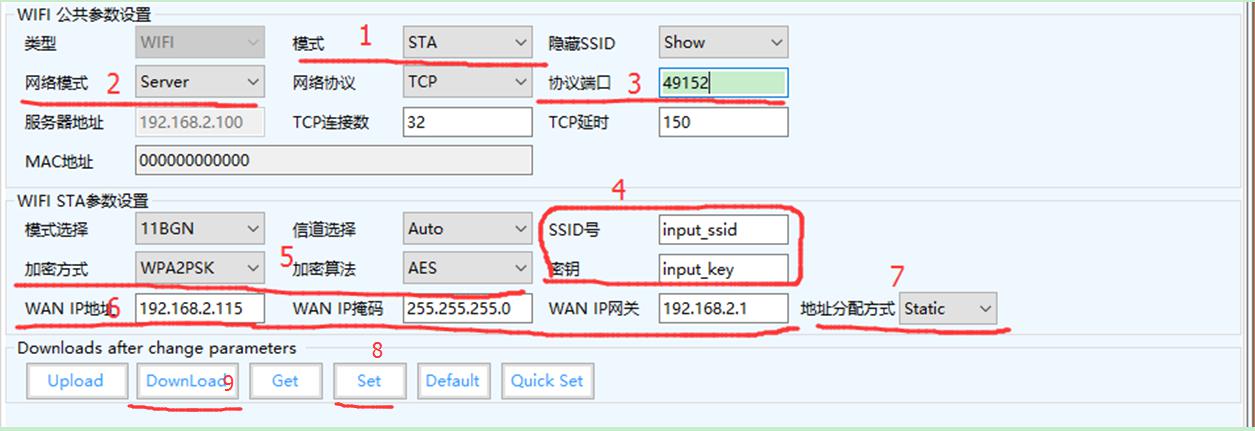 5)点击”设置”后,再点击”下载”,将设置参数设置到WIFI模块.