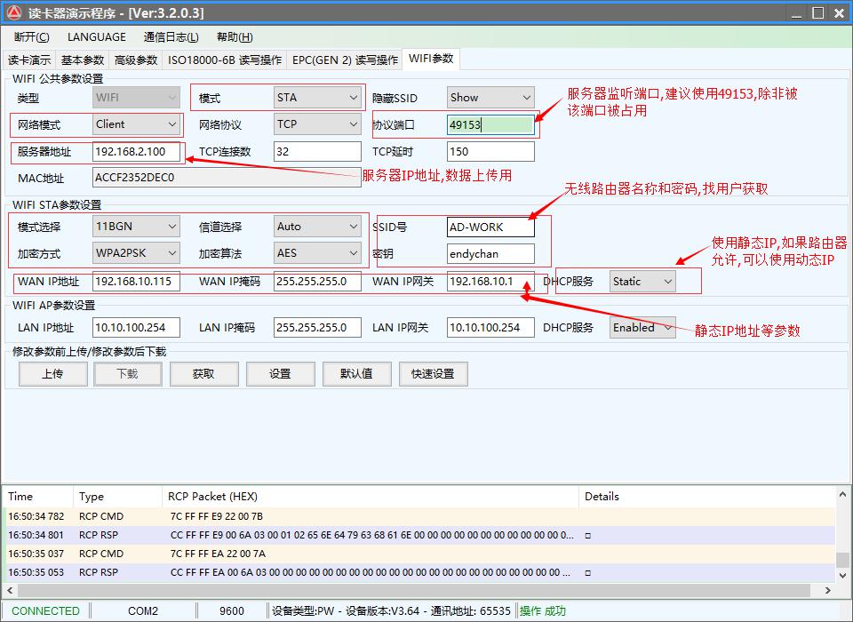 12,备注连接读卡器的电脑必须可以PING通6步骤设置的IP才能和读卡器通讯;