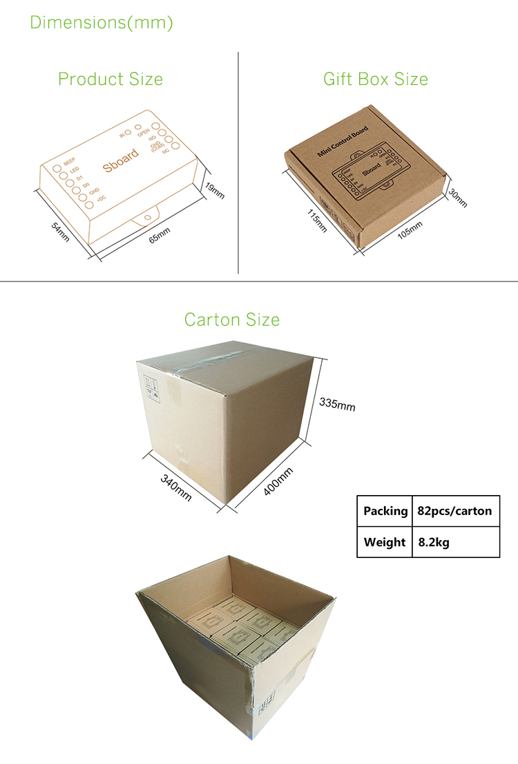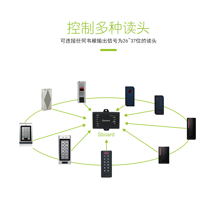 The Sboard-III is a mini size single door access control board, it supports 12~28V AD/DC power supply, Wiegand 26~44, 56, 58, 64 bits input, and it can work with external alarm.