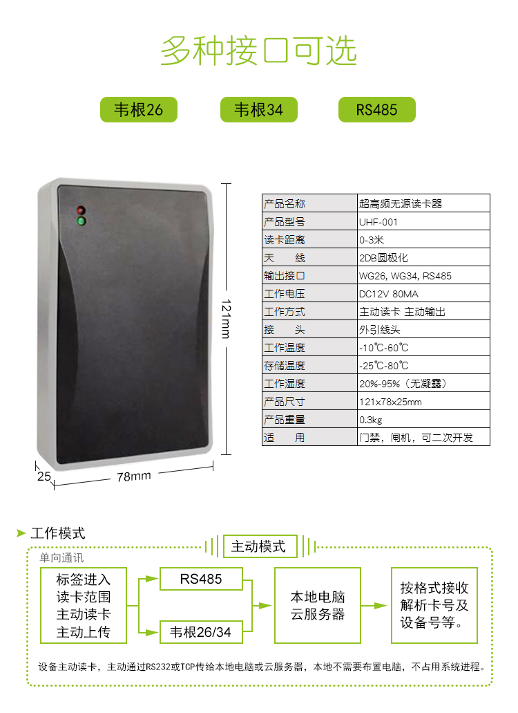 | 支持接口 | RS485、Wiegand26、Wiegand34 |
