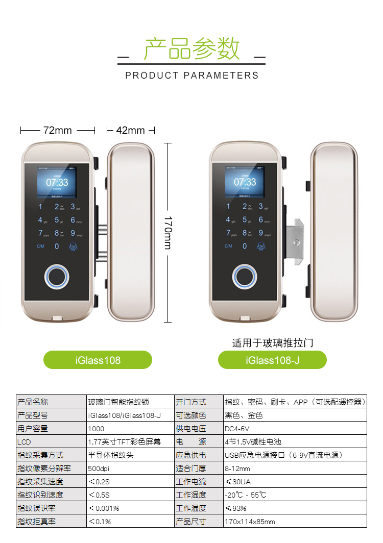 KB108-Tuya 涂鸦蓝牙玻璃门指纹锁