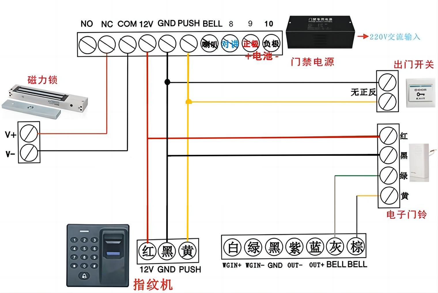 | 连接端口 | 继电器输出,开门按钮,报警器,韦根输出,门铃 |